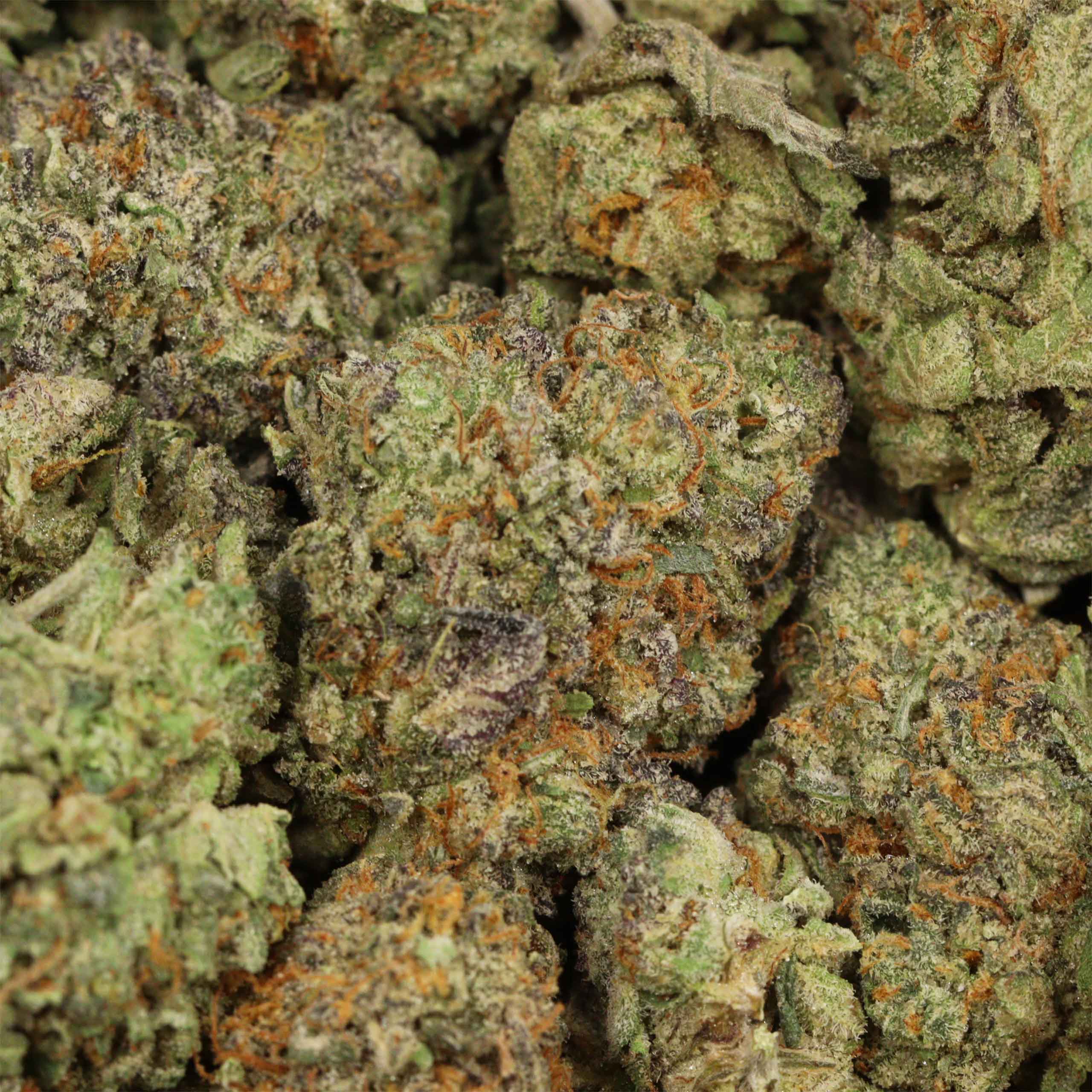 This bud has fluffy tapered forest green nugs with sparse orange hairs and a coating of tiny clear crystal trichomes.