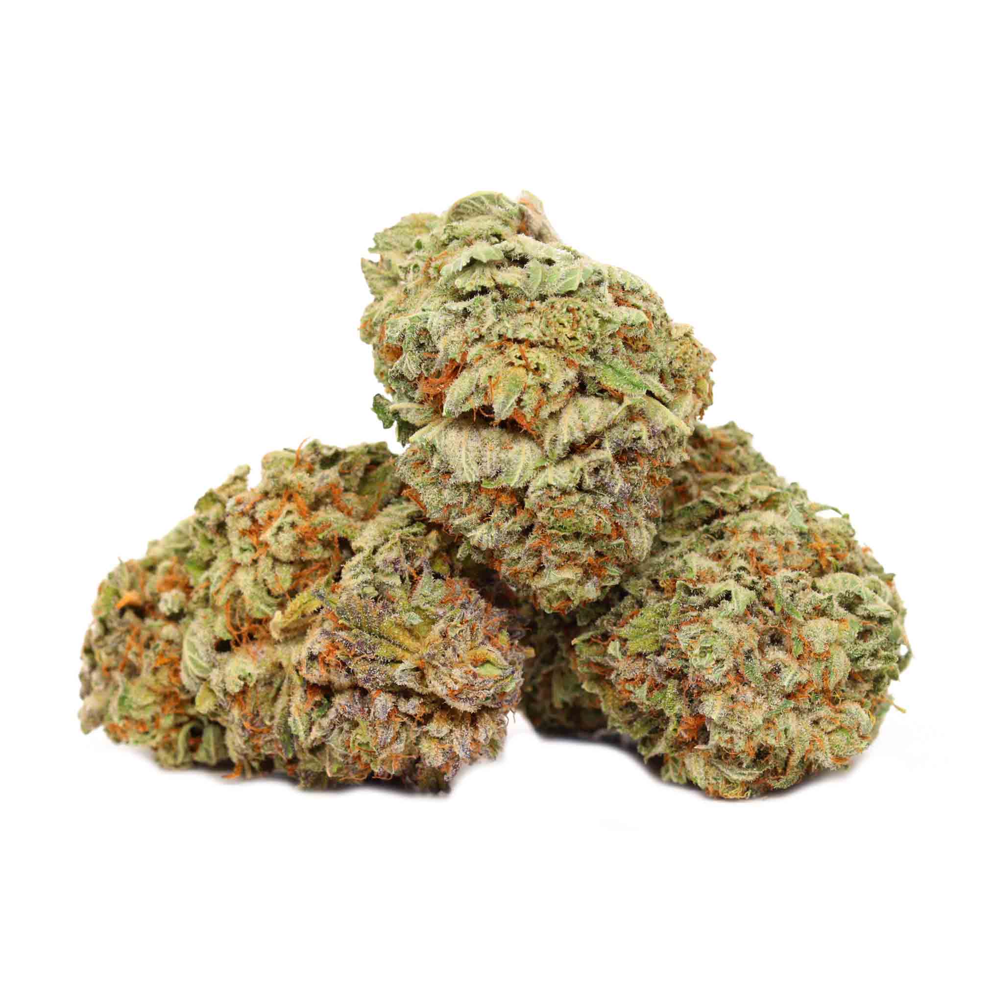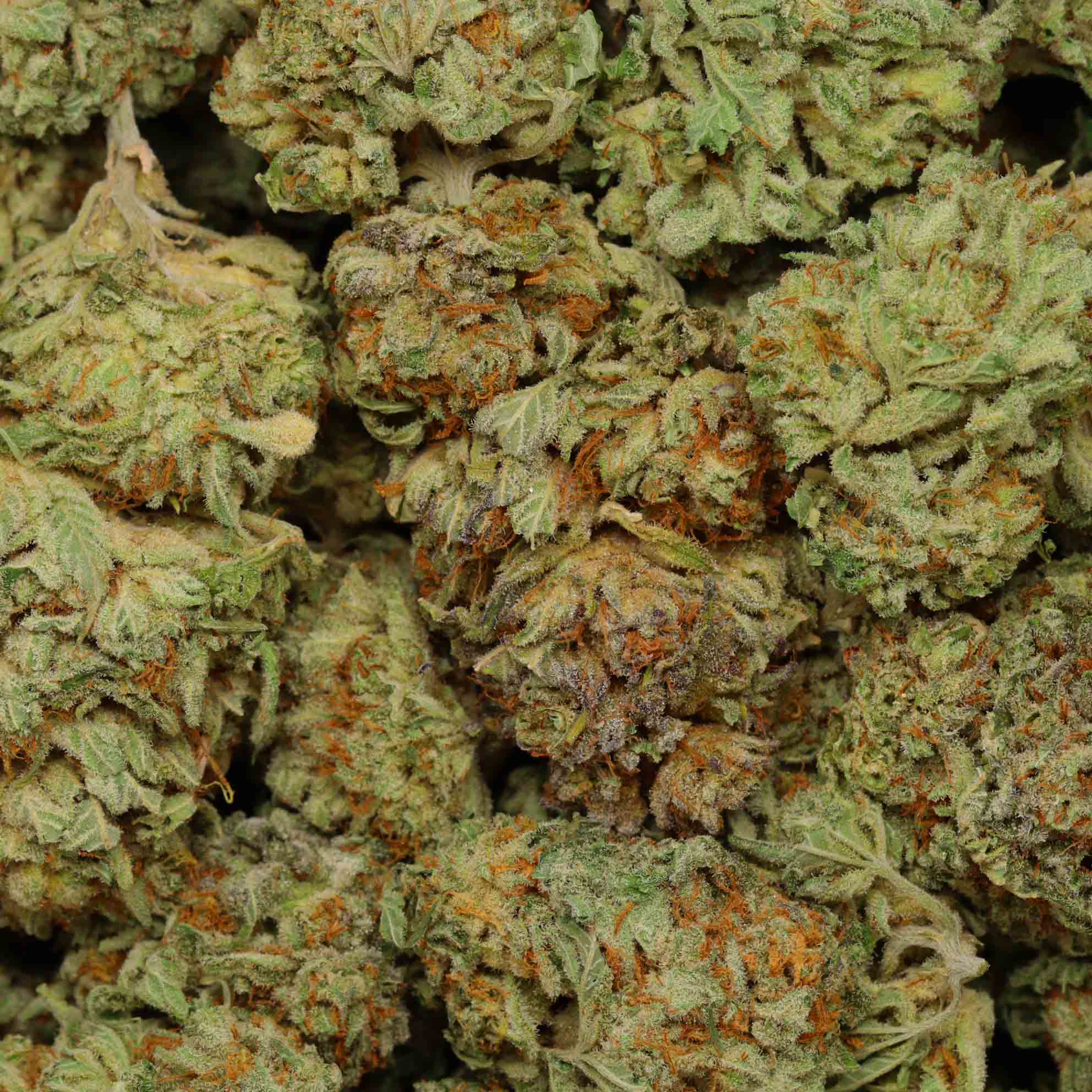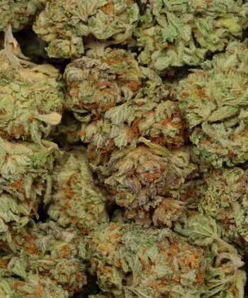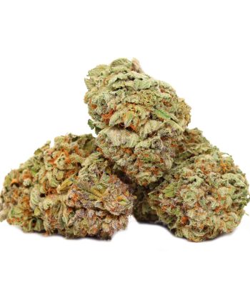 This strain’s bud have rounded oval-shaped dark green nugs with lots of thin amber hairs and a sandy coating of milky white crystal trichomes.