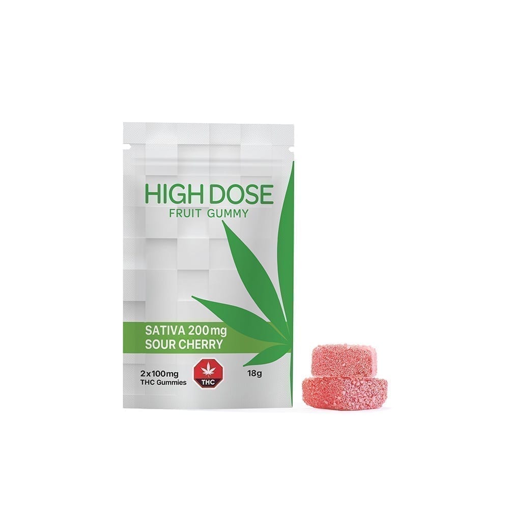 Sour Cherry Fruit Gummies Sativa 20omg THC by High Dose provide a Super potent, deliciously sour and fully infused. Not designed for the canna-curious or those new to cannabis edibles