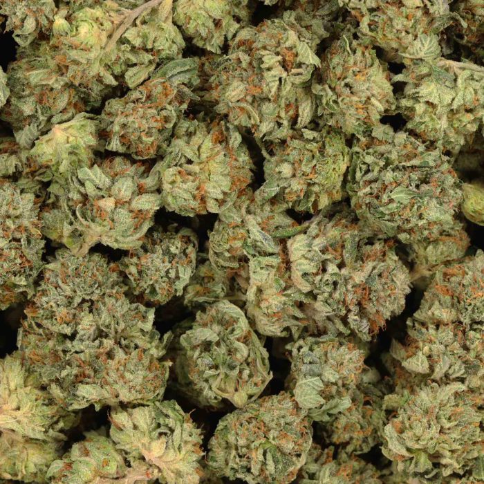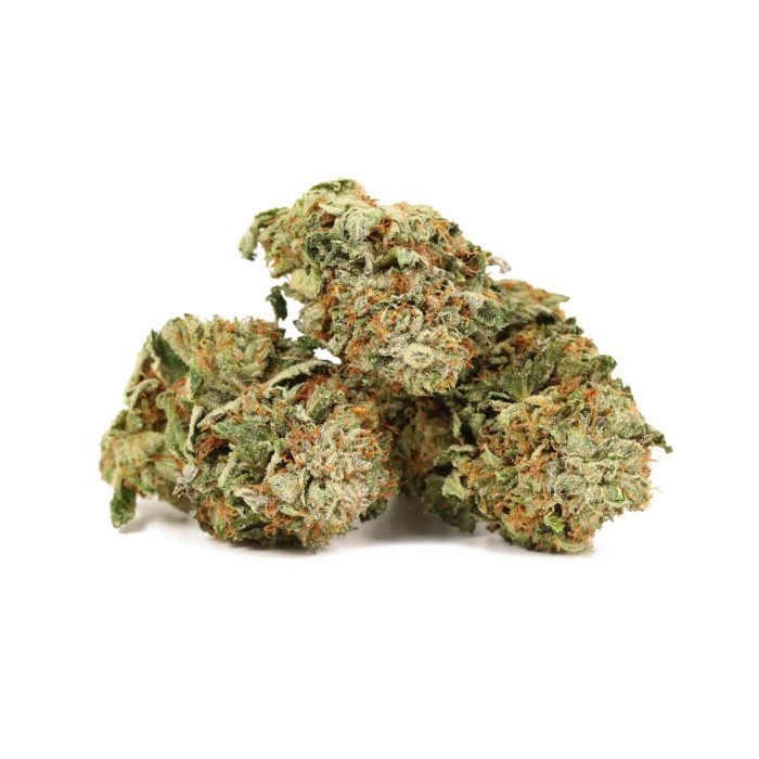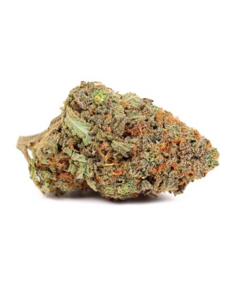 Godzilla has a pleasant sour berry taste with a hint of vanilla upon exhaling, and a sour berry smell with a touch of spice. This bud has bright lime green nugs that are dense and fluffy with purple hues and a blanket of white trichome crystals.
