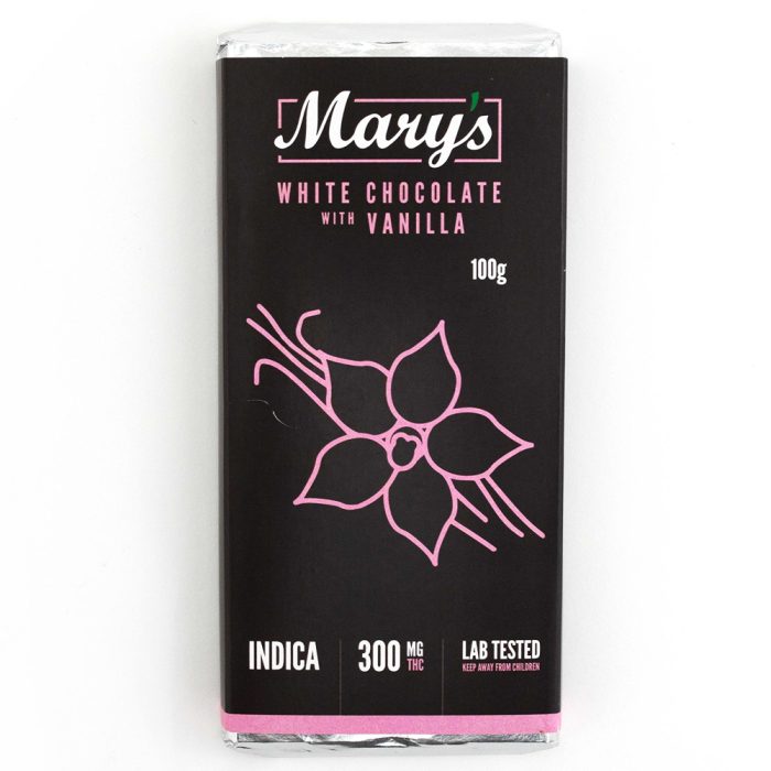 White Chocolate Bar With Vanilla (300mg THC)by Mary’s Edibles are made from premium chocolate infused with Indica cannabis. All bars are lab tested and manufactured in a licensed, inspected facility.